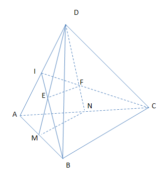 Cho tứ diện ABCD có I là trung điểm của AD. Cho M , N là 2 điểm tùy ý trên cạnh AB và AC. Tìm giao tuyến của 2 mặt phẳng (IBC) và (DMN)