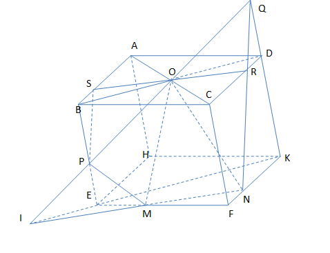 Cho hình bình hành ABCD tâm O. Vẽ các vecto bằng nhau \(\overrightarrow {AE} = \overrightarrow {BF} = \overrightarrow {CK} = \overrightarrow {DH} \). Xét điểm M nằm trên EF và điểm N nằm trên FK thỏa mãn \({{EM} \over {EF}} = {{FN} \over {FK}} = {1 \over 3}\). Xác định thiết diện tạo bởi (OMN) và khối đa diện ABCDEFKH