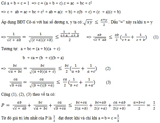 (1,0 điểm) Cho a, b, c là ba số thực dương thỏa mãn điều kiện a + b + c = 1. Tìm giá trị lớn