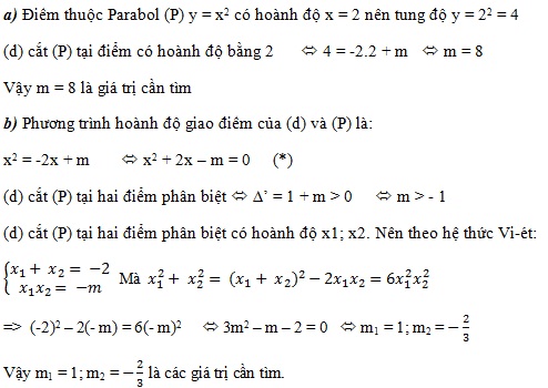 Trong mặt phẳng tọa độ Oxy cho Parabol (P) có phương trình y = x2 và đường thẳng (d) có phương trình: y = -2x + m (với m là tham số).