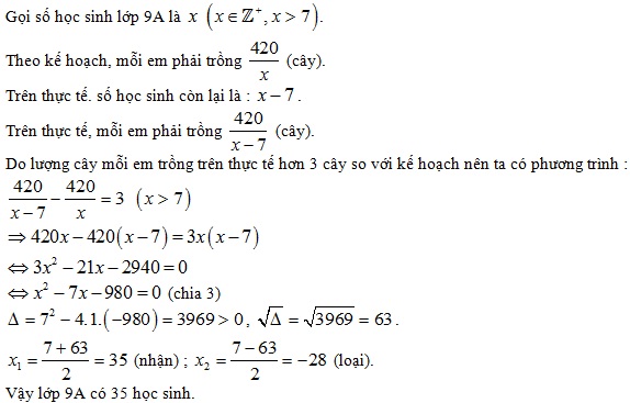 (1 điểm) Lớp 9A dự định trồng 420 cây xanh. Đến ngày thực hiện có 7 bạn không tham gia do được triệu tập học bồi dưỡng đội tuyển học sinh giỏi của nhà trường nên mỗi bạn còn lại phải trồng thêm 3 cây mới đảm bảo kế hoạch đặt ra. Hỏi lớp 9A có bao nhiêu học sinh.