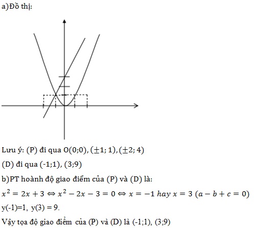 a) (0,75 điểm) Vẽ đồ thị (P) của hàm số y = x2 và thường thẳng (D): y = 2x + 3 trên cùng một