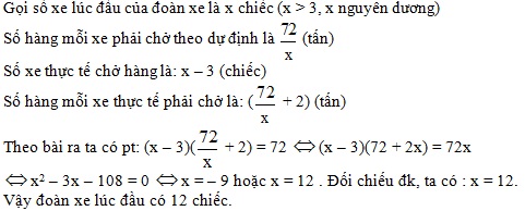 Một đội xe nhận vận chuyển 72 tấn hàng nhưng khi sắp khởi hành thì có 3 xe bị hỏng, do đó mỗi xe phải chở nhiều hơn 2 tấn so với dự định. Hỏi lúc đầu đội xe có bao nhiêu chiếc, biết khối lượng hàng mỗi xe phải chở là như nhau.