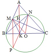 Cho tam giác nhọn ABC, đường tròn đường kính BC cắt các cạnh AB, AC lần lượt tại M, N. Gọi H