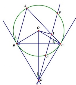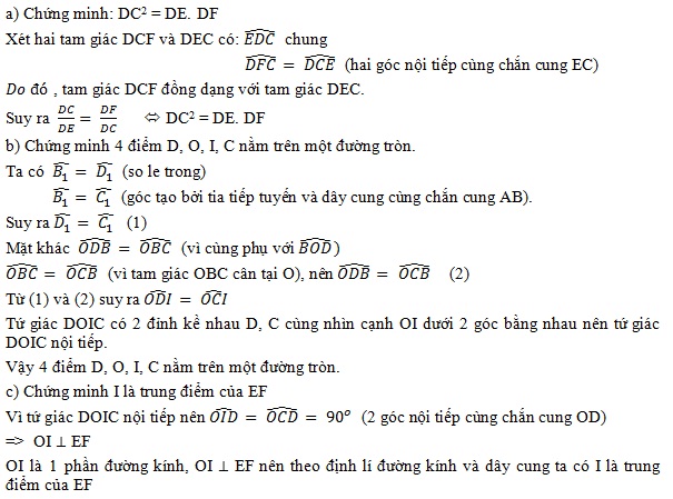 Cho tam giác ABC có ba góc nhọn nối tiếp đường tròn tâm O. Tiếp tuyến tại B và C của đường tròn (O) cắt nhau tại D. Giả sử đường thẳng đi qua điểm D song song với AB cắt được đường tròn (O) tại E, F và cắt AC tại I. Chứng minh rằng: