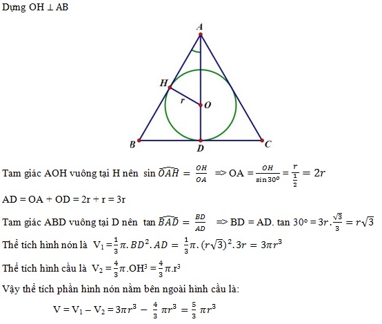 Một hình (H) gồm tam giác đều ABC và đường tròn (O; r) nội tiếp tam giác ABC (như hình vẽ bên). Cho hình (H) quay một vòng quanh đường cao AD của tam giác ABC ta được một hình cầu nằm bên trong một hình nón. Tính theo r thể tích phần hình nón nằm bên ngoài hình cầu.
