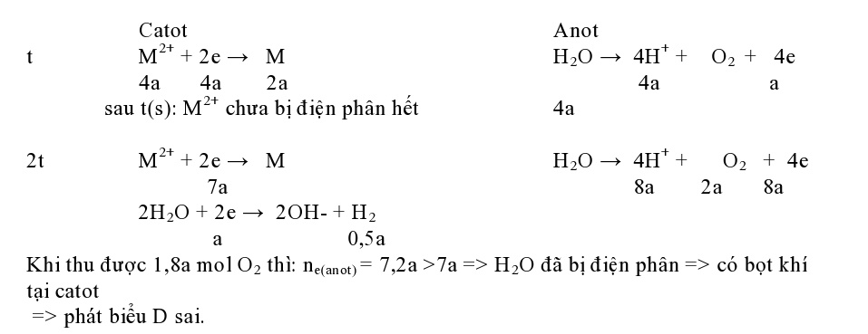 điện phân dung dịch muối MSO4 ( M là kim loại ) với điện cực trơ, cường độ dòng điện không đổi ,sau thời gian t giây, thu được a mol khí ở anot. Nếu thời gian điện phân là 2t giây thì tổng số mol khí sau điện phân thoát ra ở cả 2 điện cực là 2,5a mol. Giả sử hiệu suất điện phân là 100%, khí sinh ra không tan trong nước. Phát biểu nào sau đây sai: