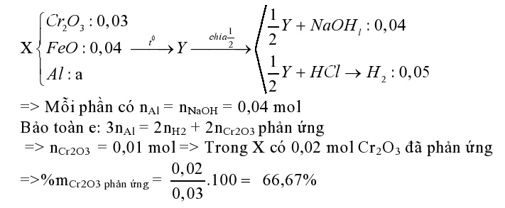 Tiến hành phản ứng nhiệt nhôm hỗn hợp X gồm 0,03 mol Cr2O3 ; 0,04 mol FeO và a mol Al. Sau một thời gian phản ứng , trộn đều thu được hỗn hợp rắn Y. Chia Y thành 2 phần bằng nhau. Phần một cho phản ứng vừa đủ với 400 ml dung dịch NaOH 0,1M (loãng). Phần 2 phản ứng với HCl loãng nóng dư thu được 1,12 lit khí H2(dktc). Giả sử trong phản ứng nhiệt nhôm , Cr2O3 chỉ bị khử thành Cr. Phần trăm khối lượng Cr2O3 đã phản ứng là;
