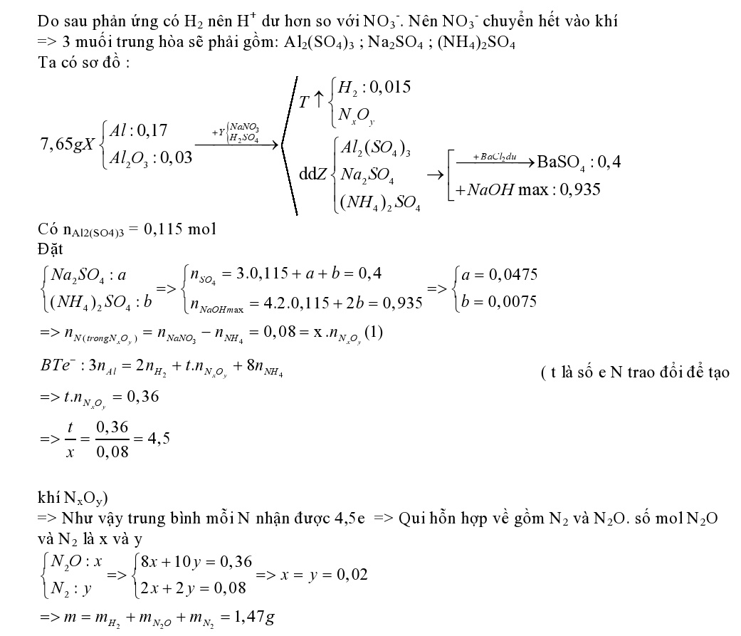 Cho 7,65 gam hỗn hợp X gồm Al và Al2O3 ( trong đó Al chiếm 60% khối lượng ) tan hoàn toàn trong dung dịch Y gồm NaNO3 và H2SO4 thu được dung dịch Z chỉ chứa 3 muối trung hòa và m gam hỗn hợp khí T (trong T có 0,015 mol H2). Cho dung dịch BaCl2 dư vào Z đến khi phản ứng xảy ra hoàn toàn thu được 93,2 gam kết tủa. Còn nếu Z phản ứng với NaOH thì lượng NaOH phản ứng tối đa là 0,935 mol . Giá trị của m gần với giá trị nào nhất sau đây: