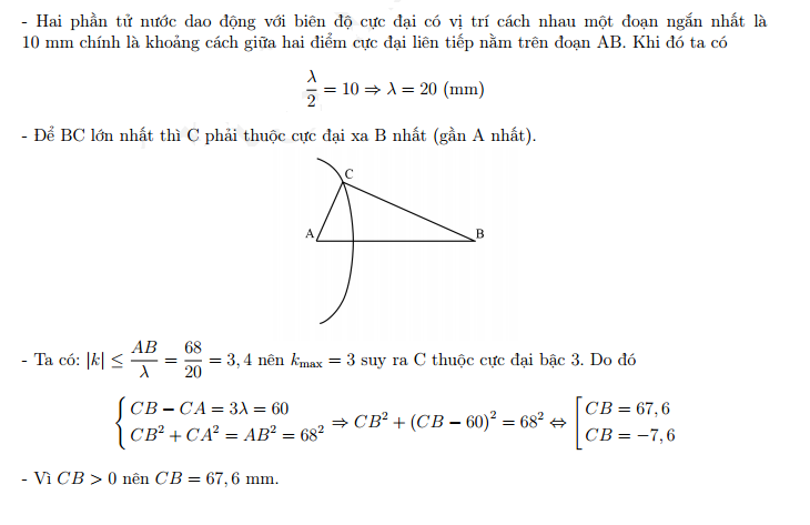 Tại mặt nước, hai nguồn kết hợp được đặt tại A và B cách nhau 68 mm, dao động điều hòa cùng tần số, cùng pha, theo phương vuông góc với mặt nước. Trên đoạn AB, hai phân tử nước dao động với biên độ cực đại có vị trí cân bằng cách nhau một đoạn ngắn nhất là 10 mm. Điểm C là vị trí cân bằng của phẩn tử ở mặt nước sao cho AC ⊥ BC. Phần tử nước ở C dao động với biên độ cực đại. Khoảng cách BC lớn nhất bằng