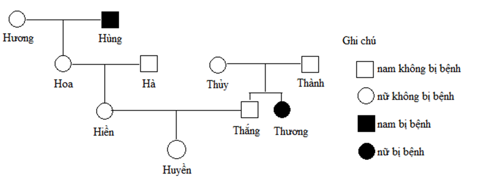 Ở một quần thể người, bệnh M do một trong hai alen của một gen quy định. Một cặp vợ chồng: Hùng bị bệnh M còn Hương không bị bệnh M, sinh được con gái là Hoa không bị bệnh M. Hoa kết hôn với Hà, Hà không bị bệnh M và đến từ một quần thể khác đang ở trạng thái cân bằng di truyền có tần số alen gây bệnh M là 1/10, sinh được con gái là Hiền không bị bệnh M. Một cặp vợ chồng khác là Thành và Thủy đều không bị bệnh M, sinh được con gái là Thương bị bệnh M và con trai là Thắng không bị bệnh M. Thắng và Hiền kết hôn với nhau, sinh con gái đầu lòng là Huyền không bị bệnh M. Biết rằng không xảy ra đột biến mới ở tất cả những người trong các gia đình. Dựa vào các thông tin trên, hãy cho biết, trong các dự đoán sau, có bao nhiêu dự đoán đúng?