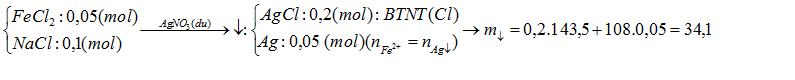 Hoà tan hoàn toàn 12,2 gam hỗn hợp gồm FeCl2 và NaCl (có tỉ lệ số mol tương ứng là 1:2) vào một lượng nước dư, thu được dung dịch X. Cho dung dịch AgNO3 dư vào X, sau khi phản ứng xảy ra hoàn toàn, thu được m gam chất rắn. Giá trị của m là
