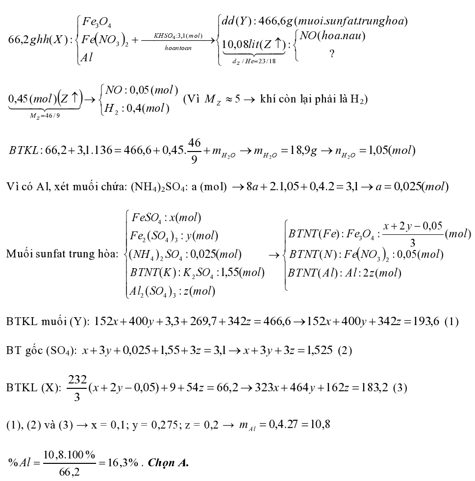 Cho 66,2 gam hỗn hợp X gồm Fe3O4, Fe(NO3)2, Al tan hoàn toàn trong dung dịch chứa 3,1 mol KHSO4 loãng. Sau khi các phản ứng xảy ra hoàn toàn thu được dung dịch Y chỉ chứa 466,6 gam muối sunfat trung hòa và 10,08 lít (đktc) khí Z gồm 2 khí trong đó có một khí hóa nâu ngoài không khí. Biết tỉ khối của Z so với He là 23/18. Phần trăm khối lượng của Al trong hỗn hợp X gần nhất với giá trị nào sau đây?