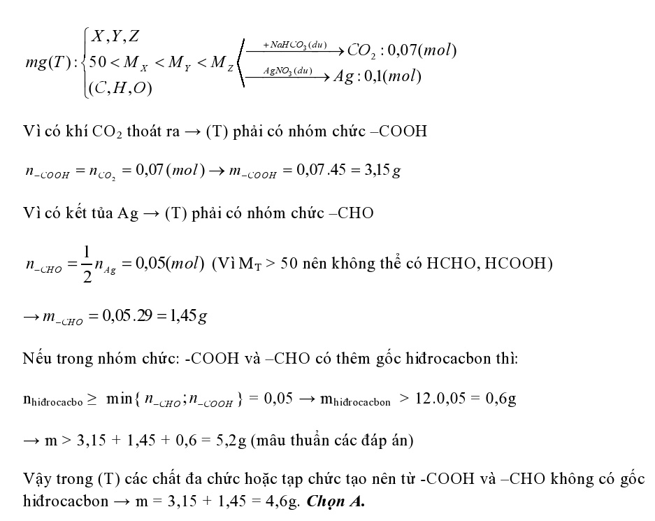 Hỗn hợp T gồm ba chất hữu cơ X, Y, Z (50 < MX < MY < MZ và đều tạo nên từ các nguyên tố C, H, O). Đốt cháy hoàn toàn m gam T thu được H2O và 2,688 lít khí CO2 (đktc). Cho m gam T phản ứng với dung dịch NaHCO3 dư, thu được 1,568 lít khí CO2 (đktc). Mặt khác, cho m gam T phản ứng hoàn toàn với lượng dư dung dịch AgNO3 trong NH3, thu được 10,8 gam Ag. Giá trị của m là