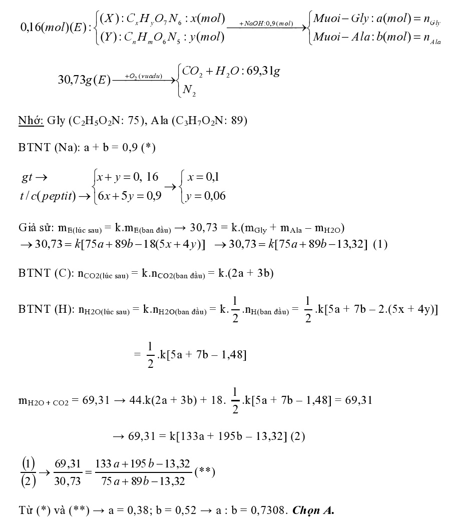 Đun nóng 0,16 mol hỗn hợp E gồm hai peptit X (CxHyOzN6) và Y (CnHmO6Nt) cần dùng 600 ml dung dịch NaOH 1,5M chỉ thu được dung dịch chứa a mol muối của glyxin và b mol muối của alanin. Mặt khác đốt cháy 30,73 gam E trong O2 vừa đủ thu được hỗn hợp CO2, H2O và N2, trong đó tổng khối lượng của CO2 và nước là 69,31 gam. Giá trị a : b gần nhất với
