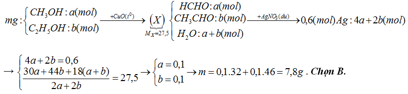 Cho m gam hỗn hợp gồm hai ancol no, đơn chức, kế tiếp nhau trong dãy đồng đẳng, tác dụng với CuO dư, nung nóng, thu được hỗn hợp X gồm khí và hơi có tỉ khối hơi so với H2 là 13,75. Cho X phản ứng với lượng dư dung dịch AgNO3 trong NH3 đun nóng, thu được 64,8 gam Ag. Giá trị của m là