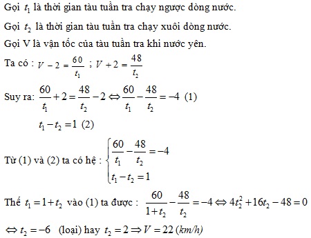 Một tàu tuần tra chạy ngược dòng 60km, sau đó chạy xuôi dòng 48km trên cùng một dòng sông có vận tốc của dòng nước là 2km/giờ. Tính vận tốc của tàu tuần tra khi nước yên lặng, biết thời gian xuôi dòng ít hơn thời gian ngược dòng 1 giờ.
