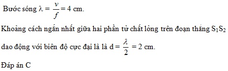 Tại mặt thoáng của một chất lỏng có hai nguồn sóng S1 và S2 dao động theo phương thẳng đứng với cùng phương trình u = acos40πt (a không đổi, t tính bằng s). Tốc độ truyền sóng trên mặt chất lỏng bằng 80 cm/s. Khoảng cách ngắn nhất giữa hai phần tử chất lỏng trên đoạn thẳng S1S2 dao động với biên độ cực đại là
