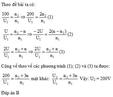 Đặt vào hai đầu cuộn sơ cấp của một máy biến áp lí tưởng (bỏ qua hao phí) một điện áp xoay chiều có giá trị hiệu dụng không đổi thì điện áp hiệu dụng giữa hai đầu cuộn thứ cấp để hở là 100V. Ở cuộn thứ cấp, nếu giảm bớt n vòng dây thì điện áp hiệu dụng giữa hai đầu để hở của nó là U, nếu tăng thêm n vòng dây thì điện áp đó là 2U. Nếu tăng thêm 3n vòng dây ở cuộn thứ cấp thì điện áp hiệu dụng giữa hai đầu để hở của cuộn này bằng