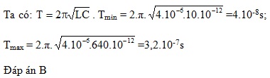 Một mạch dao động lí tưởng gồm cuộn cảm thuần có độ tự cảm 4 μH và một tụ điện có điện dung biến đổi từ 10 pF đến 640 pF. Lấy π2=10. Chu kì dao động riêng của mạch này có giá trị