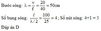Một sợi dây AB dài 100 cm căng ngang, đầu B cố định, đầu A gắn với một nhánh của âm thoa dao động điều hòa với tần số 40 Hz. Trên dây AB có một sóng dừng ổn định, A được coi là nút sóng. Tốc độ truyền sóng trên dây là 20 m/s. Kể cả A và B, trên dây có