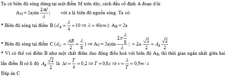 Một sợi dây đàn hồi căng ngang, đang có sóng dừng ổn định. Trên dây, A là một điểm nút, B là một điểm bụng gần A nhất, C là trung điểm của AB, với AB = 10 cm. Biết khoảng thời gian ngắn nhất giữa hai lần mà li độ dao động của phần tử tại B bằng biên độ dao động của phần tử tại C là 0,2 s. Tốc độ truyền sóng trên dây là