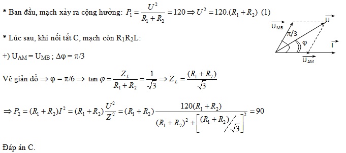 Một đoạn mạch AB gồm hai đoạn mạch AM và MB mắc nối tiếp. Đoạn mạch AM gồm điện trở thuần R1 mắc nối tiếp với tụ điện có điện dung C, đoạn mạch MB gồm điện trở thuần R2 mắc nối tiếp với cuộn cảm thuần có độ tự cảm L. Đặt điện áp xoay chiều có tần số và giá trị hiệu dụng không đổi vào hai đầu đoạn mạch AB. Khi đó đoạn mạch AB tiêu thụ công suất bằng 120 W và có hệ số công suất bằng 1. Nếu nối tắt hai đầu tụ điện thì điện áp hai đầu đoạn mạch AM và MB có cùng giá trị hiệu dụng nhưng lệch pha nhau π/3, công suất tiêu thụ trên đoạn mạch AB trong trường hợp này bằng