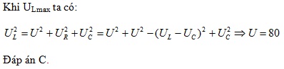 vào hai đầu đoạn mạch mắc nối tiếp gồm điện trở thuần R, tụ điện có điện dung C và cuộn cảm thuần có độ tự cảm L thay đổi được. Điều chỉnh L để điện áp hiệu dụng ở hai đầu cuộn cảm đạt giá trị cực đại thì thấy giá trị cực đại đó bằng 100 V và điện áp hiệu dụng ở hai đầu tụ điện bằng 36 V. Giá trị của U là
