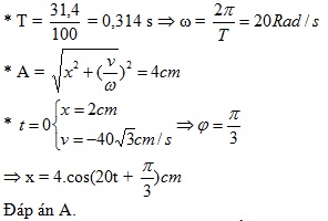 Một chất điểm dao động điều hòa trên trục Ox. Trong thời gian 31,4 s chất điểm thực hiện được 100 dao động toàn phần. Gốc thời gian là lúc chất điểm đi qua vị trí có li độ 2 cm theo chiều âm với tốc độ là 40√3 cm/s. Lấy π = 3,14. Phương trình dao động của chất điểm là
