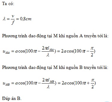 Tại hai điểm A và B trên mặt nước có hai nguồn kết hợp cùng dao động với phương trình uA = uB = a cos(100 πt) ; trong đó t tính bằng giây. Tốc độ truyền sóng trên mặt nước là 40(cm/s). Xét điểm M trên mặt nước có AM = 9 cm và BM = 7 cm . Hai dao động tại M do hai sóng từ A và B truyền đến hai dao động: