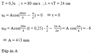 Một sóng cơ có chu kì 0,3s lan truyền từ nguồn O, dọc theo trục Ox với biên độ sóng không đổi và tốc độ truyền sóng 80cm/s. Biết rằng tại thời điểm t, phần tử tại O qua vị trí cân bằng theo chiều dương, sau thời điểm đó một khoảng thời gian 0,25s, phần tử tại điểm M cách O một đoạn 4cm có li độ là – 6 mm. Biên độ của sóng là: