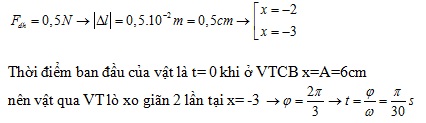 Một con lắc lò xo nằm ngang trên mặt bàn nhẵn cách điện gồm vật nặng tích điện q=100µC, lò xo có độ cứng k=100N/m, trong một điện trường đều E có hướng dọc theo trục lò xo theo chiều lò xo giãn. Từ VTCB kéo vật một đoạn 6cm rồi thả nhẹ, vật dao động điều hòa, tốc độ khi qua VTCB là 1,2 m/s. Độ lớn cường độ điện trường E là 2,5.104 V/m. Thời điểm vật qua vị trí có Fđh = 0,5N lần thứ 2 là.