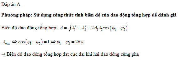 Cho 2 dao động điều hòa cùng phương, cùng tần số có phương trình x1 = A1cos(ωt +φ1); x2 = A2cos(ωt + φ2). Biên độ dao động tổng hợp có giá cực đại khi