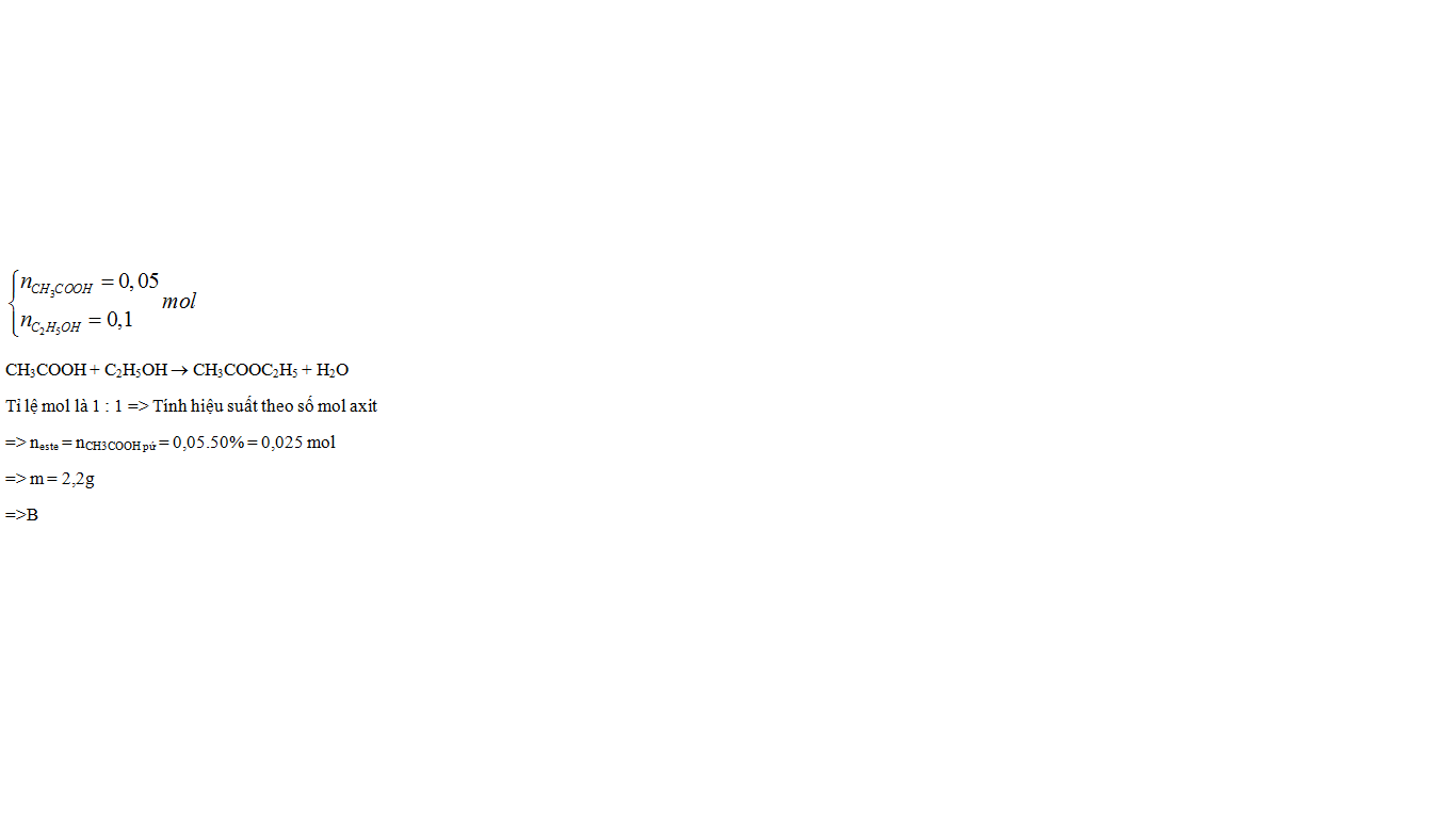 Đun 3,0 gam CH3COOH với 4,6 gam C2H5OH dư (xúc tác H2SO4 đặc), thu được m gam CH3COOC2H5. Biết hiệu suất của phản ứng este hoá đạt 50 %. Giá trị của m là