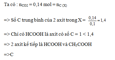 Đốt cháy hoàn toàn 0,1 mol hỗn hợp X gồm 2 axit cacboxylic đồng đẳng kế tiếp thu được 6,16 gam CO2 và 2,52 gam H2O. Công thức của 2 axit là: