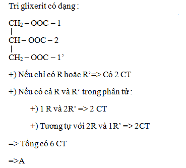Khi đun nóng hỗn hợp gồm glixerol và 2 axit béo RCOOH và R’COOH có thể thu được tối đa bao nhiêu loại chất béo (tri glixerit)?
