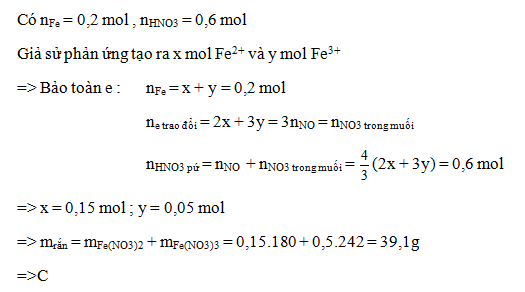 Hoà tan hoàn toàn 11,2g kim loại Fe trong 300ml dung dịch HNO3 2M, sau khi các phản ứng xảy ra hoàn toàn thấy có khí NO (duy nhất) thoát ra. Cô cạn dung dịch sau phản ứng ta thu được chất rắn khan có khối lượng là
