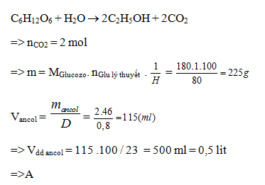 Lên men m gam glucozơ với hiệu suất 80% thu được 44,8 lít khí CO2 (ở đktc) và V lít ancol etylic 23o (biết khối lượng riêng của C2H5OH là 0,8 gam/ml). Giá trị m và V lần lượt là: