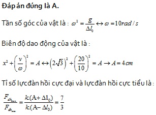 cm rồi truyền cho nó một vận tốc v0 = 20cm/s theo phương thẳng đứng xuống dưới. Sau khi được truyền vận tốc vật dao động điều hòa. Lấy g = 10m/s2. Tỉ số giữa lực đàn hồi cực đại và cực tiểu của lò xo: