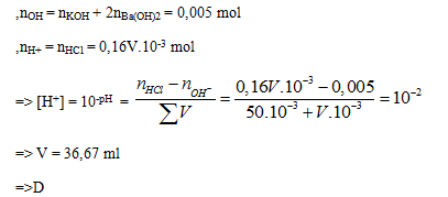 Có 50 ml dung dịch chứa hỗn hợp KOH 0,05M và Ba(OH)2 0,025M người ta thêm V ml dung dịch HCl 0,16M vào 50 ml dung dịch trên thu được dung dịch mới có pH = 2. Vậy giá trị của V là