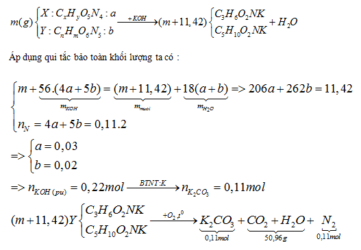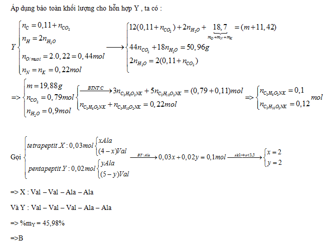 Thủy phân hoàn toàn m gam hỗn hợp M gồm tetrapeptit X và pentapeptit Y (đều mạch hở) bằng dung dịch KOH vừa đủ, rồi cô cạn cẩn thận thì thu được (m + 11,42) gam hỗn hợp muối khan của Val và Ala. Đốt cháy hoàn toàn muối sinh ra bằng một lượng oxi vừa đủ thu được K2CO3; 2,464 lít N2 (đktc) và 50,96 gam hỗn hợp gồm CO2 và H2O. Phần trăm khối lượng của Y trong hỗn hợp M có thể là
