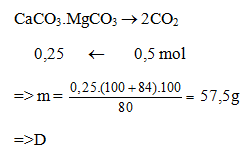 Nhiệt phân hoàn toàn m gam quặng đolomit (chứa 80% CaCO3.MgCO3 theo khối lượng, còn lại là tạp chất trơ) thu được 11,2 lít khí CO2 (đktc). Giá trị của m là