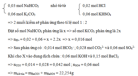 Cho từ từ, đồng thời khuấy đều 300 ml dung dịch hỗn hợp gồm: NaHCO3 0,1M và K2CO3 0,2M vào 100 ml dung dịch hỗn hợp gồm: HCl 0,2M và NaHSO4 0,6M thu được V lít CO2 (đktc) và dung dịch X. Thêm vào dung dịch X 100 ml dung dịch hỗn hợp gồm: KOH 0,6M và BaCl2 1,5M thu được m gam kết tủa. Giá trị của m là