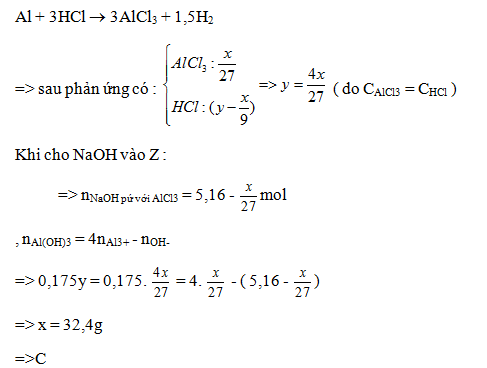 Cho x gam Al tan hoàn toàn vào dung dịch chứa y mol HCl thu được dung dịch Z chứa 2 chất tan có cùng nồng độ mol. Thêm từ từ dung dịch NaOH vào dung dịch Z thì đồ thị biểu diễn lượng kết tủa phụ thuộc vào lượng OH- như sau: