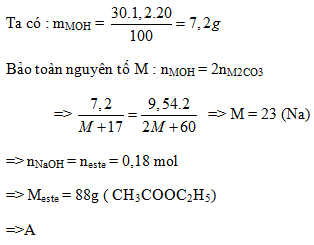 Cho 15,84 gam este no, đơn chức, mạch hở vào cốc chứa 30ml dung dịch MOH 20% (d=1,2g/ml) với M là kim loại kiềm. Sau phản ứng hoàn toàn, cô cạn dung dịch thu được chất rắn X. Đốt cháy hoàn toàn X thu được 9,54gam M2CO3 và hỗn hợp gồm CO2, H2O. Kim loại M và este ban đầu là