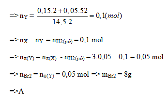 Hỗn hợp khí X có thể tích 4,48 lít (đo ở đktc) gồm H2 và vinylaxetilen có tỉ lệ mol tương ứng là 3:1. Cho hỗn hợp X qua xúc tác Ni nung nóng thu được hỗn hợp khí Y có tỉ khối so với H2 bằng 14,5. Cho toàn bộ hỗn hợp Y ở trên từ từ qua dung dịch nước brom dư thì khối lượng brom đã phản ứng là