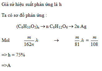 Thủy phân m (gam) xenlulozơ trong môi trường axit. Sau một thời gian phản ứng, đem trung hòa axit bằng kiềm, sau đó cho hỗn hợp tác dụng hoàn toàn với dung dịch AgNO3 trong NH3 thu được m (gam) Ag. Xác định hiệu suất của phản ứng thủy phân xenlulozơ ?