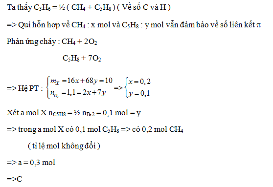 Hỗn hợp X gồm metan, propen, isopren. Đốt cháy hoàn toàn 10 gam X cần vừa đủ 24,64 lít O2 (đktc). Mặt khác, a mol X phản ứng tối đa với 200 ml dung dịch Br2 1M. Giá trị của a là