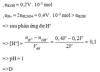 Trộn lẫn V ml dung dịch KOH 0,2M với V ml dung dịch H2SO4 0,2M thu được 2V ml dung dịch X. Dung dịch X có pH bằng