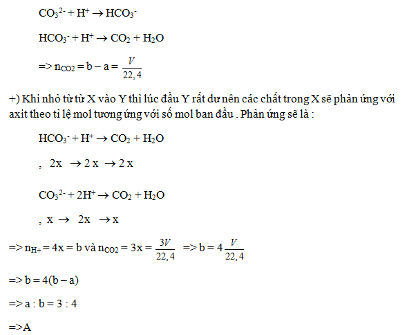 Dung dịch X chứa a mol Na2CO3 và 2a mol KHCO3; dung dịch Y chứa b mol HCl. Nhỏ từ từ đến hết Y vào X, sau các phản ứng thu được V lít CO2 (đktc). Nếu nhỏ từ từ đến hết X vào Y, sau các phản ứng thu được 3V lít CO2 (đktc). Tỉ lệ a : b là